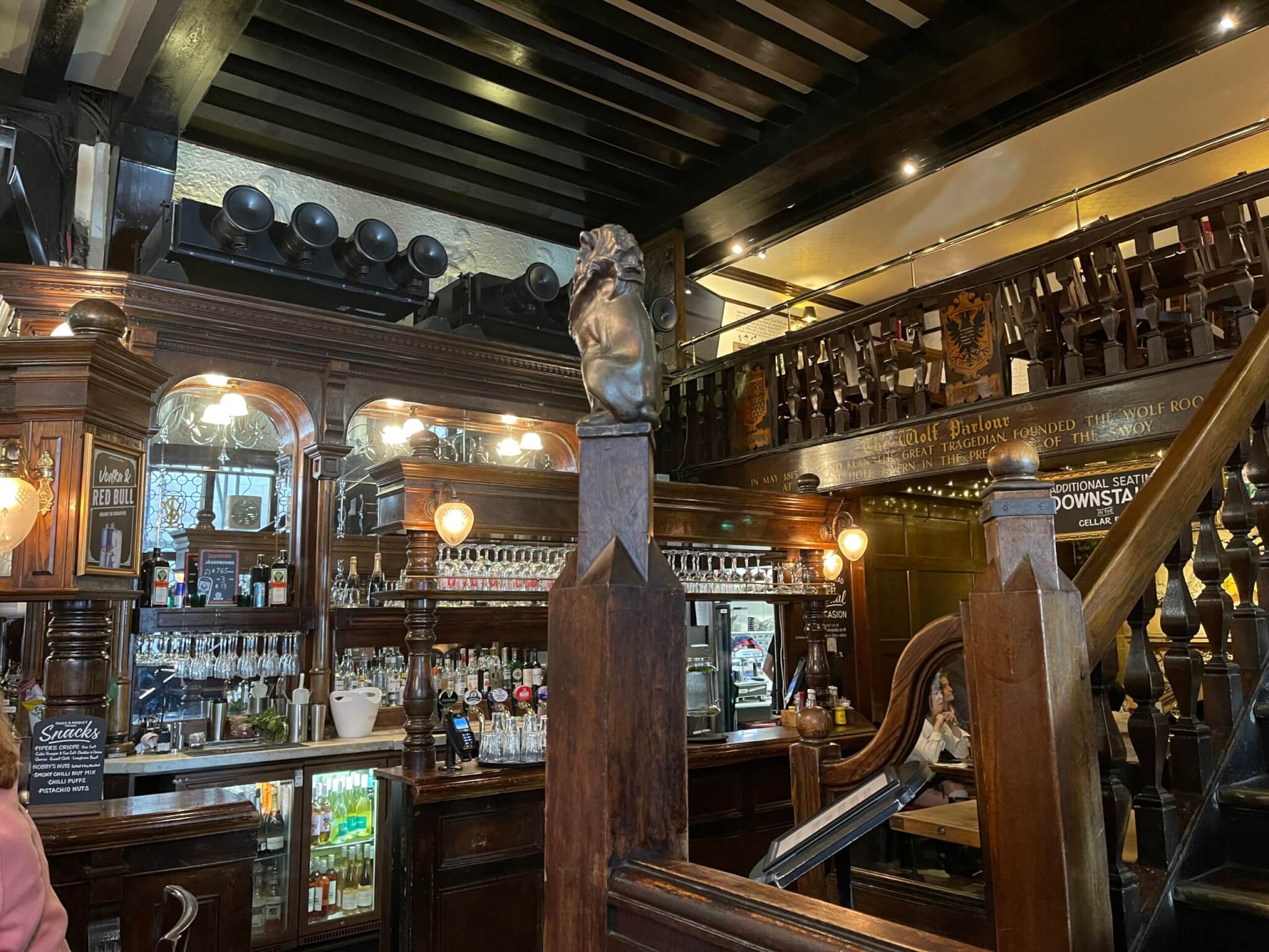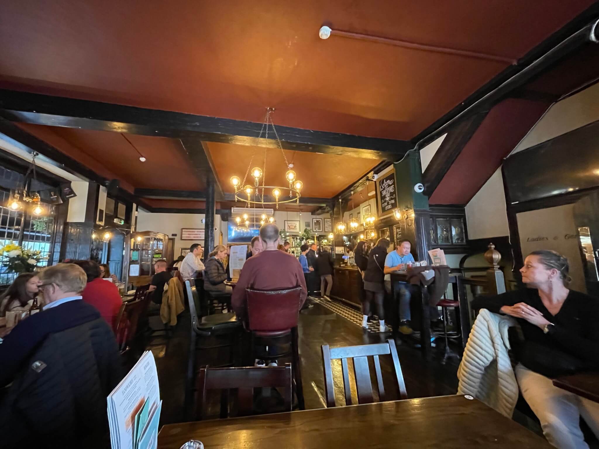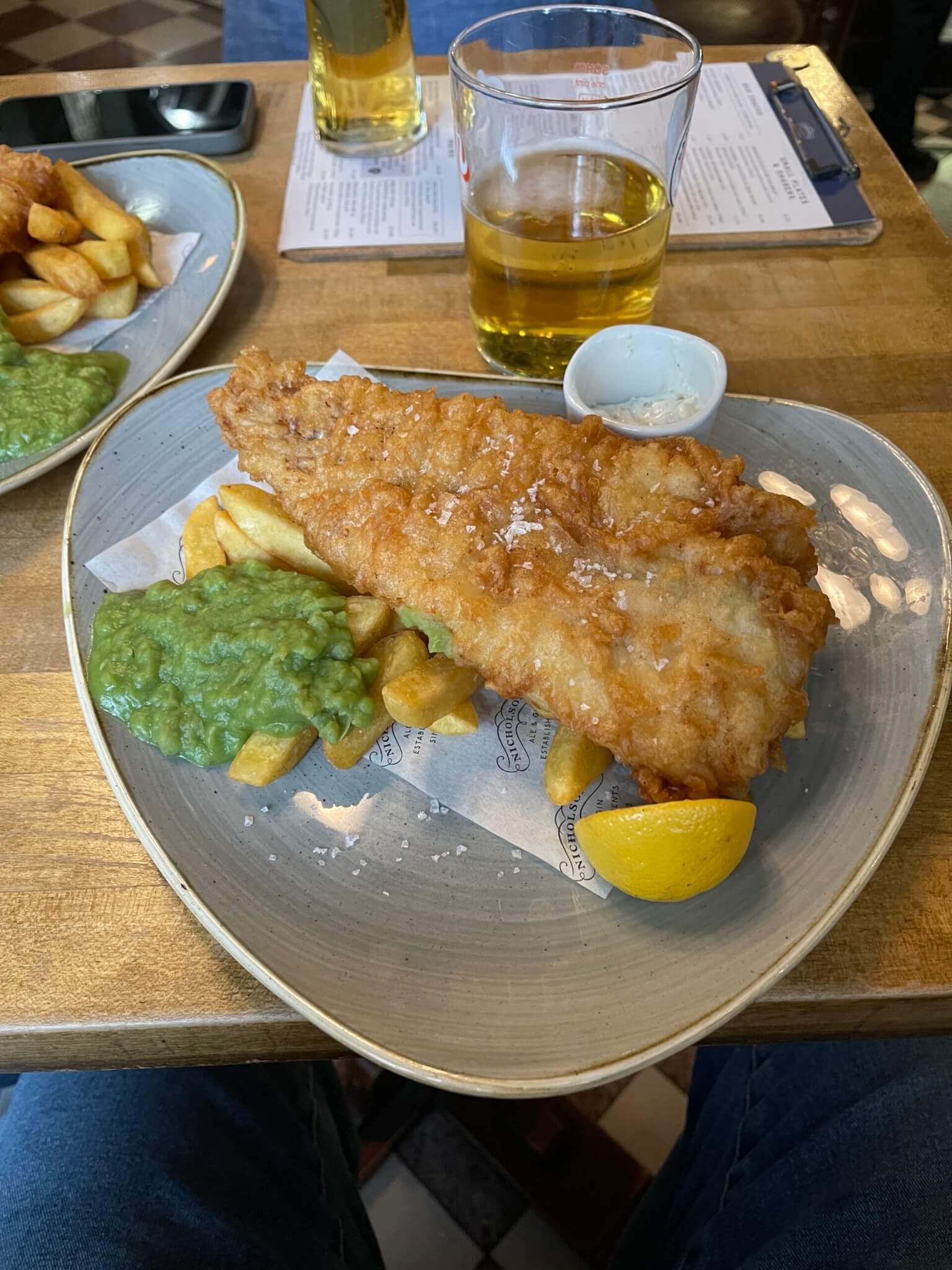 Nun geht es aber los, es ist schon 16:00 Uhr und wir (eher ich) haben noch viel geplant. Demokratisch fällt der Beschluss, wir brauchen was zu essen. Auf Empfehlung eines Kollegen suchen wir den Pub „The Coal Hole„, der liegt eh passend zu meiner geplanten Route. Auch hier zwar sind ein paar Menschen auf der Straße, aber im Pub haben wir bequem einen Platz bekommen. Dann schnell das erste Pint bestellt. Es ist Karfreitag, also gibt es Fish & Chips. Für ein Kohleloch, ein toller Pub.