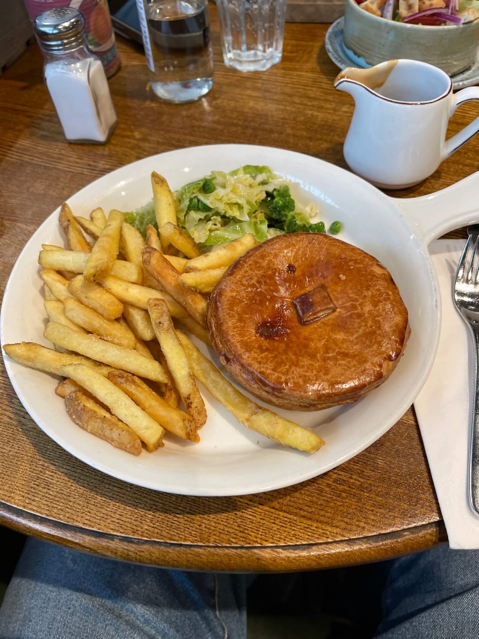 Ach, nach dem Pint ist vor dem Pint. Wie immer der letzte Pub vor dem Abflug ist am Flughafen. Jetzt gibt es doch noch eine Stake and Ale Pie und ein, zwei Bierchen bis der Flieger startet.