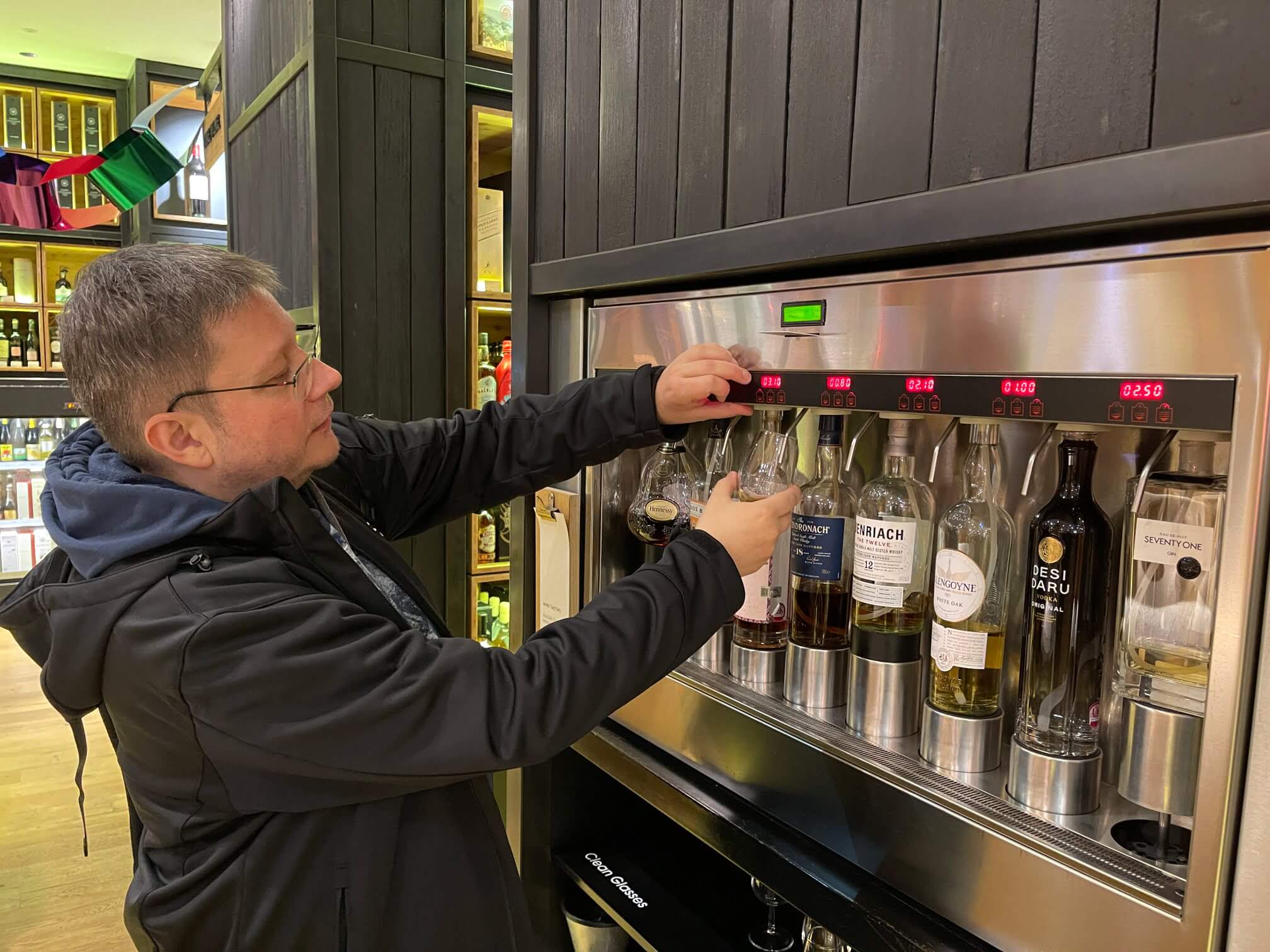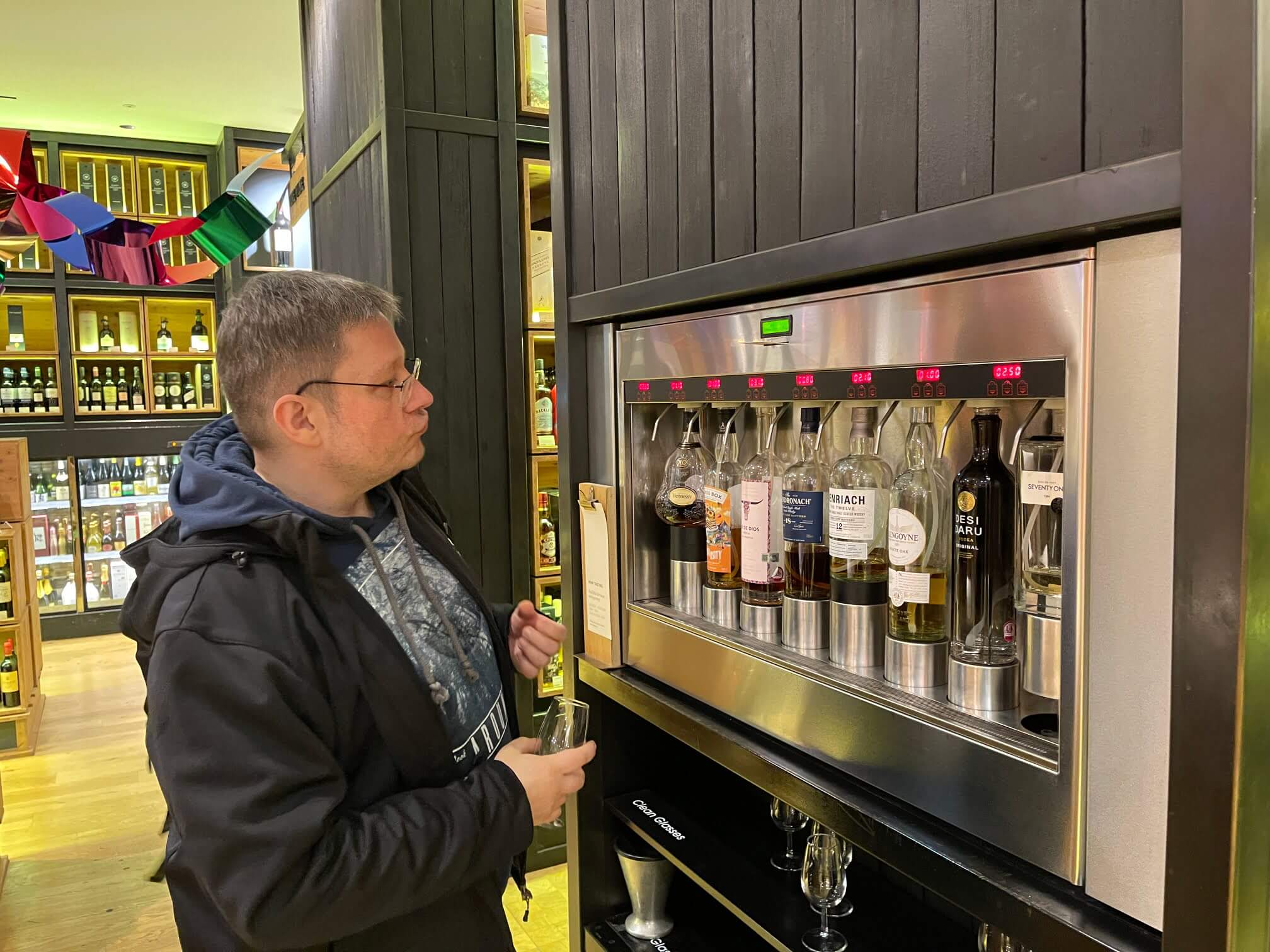 Oh meine Güte, was für ein Kaufhaus. Selfridge. Rolex, Gucci, und alles was viel Geld kostet auf 4 Stockwerken. Im EG die Getränkeabteilung. Leider war an der Sektbar kein Platz frei, dann nehmen wir den Automaten für Proben und lassen uns so Alkohol geben.