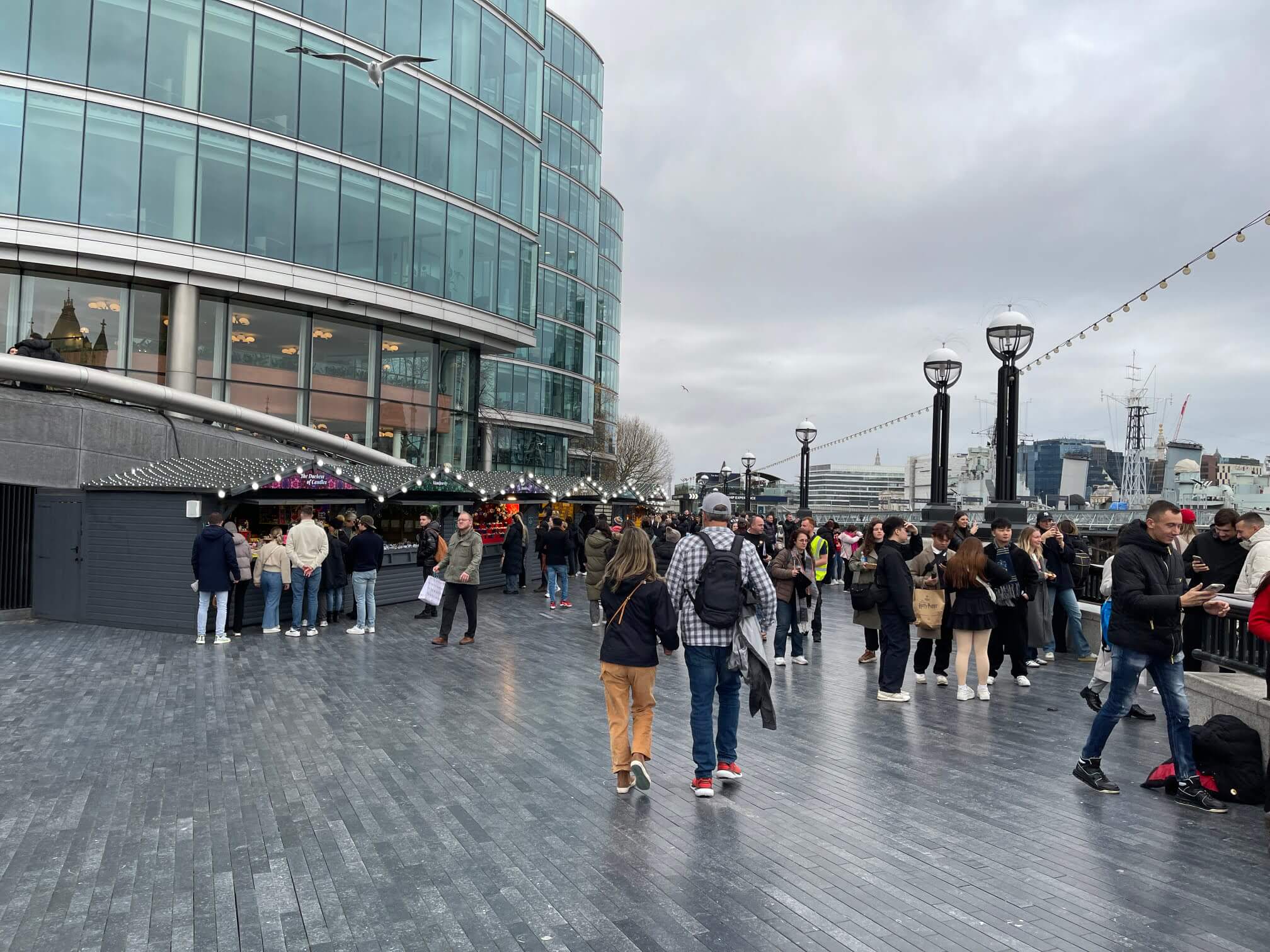 Nach einer doch guten Nacht, startet der Tag mit Koffer packen, Frühstück und Check-Out. Nochmals die Koffer abgeben und auf zum Tower. Erstaunlich, hier ist gar nicht so viel los und wir sehen uns entspannt um. Danach über die Tower Bridge zum Queenswalk in Richtung London Bridge. Den Weihnachtsmarkt nehmen wir noch mit. Sechs habe wir dann geschafft