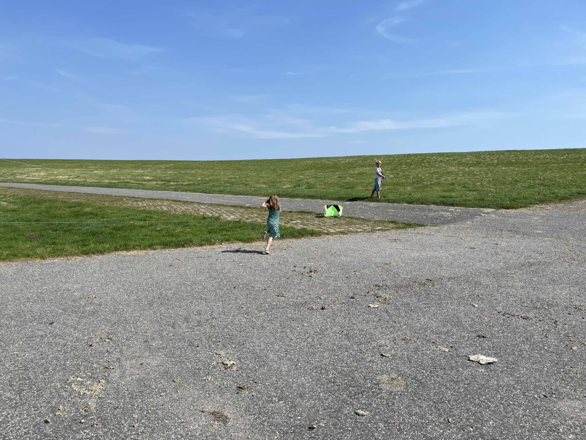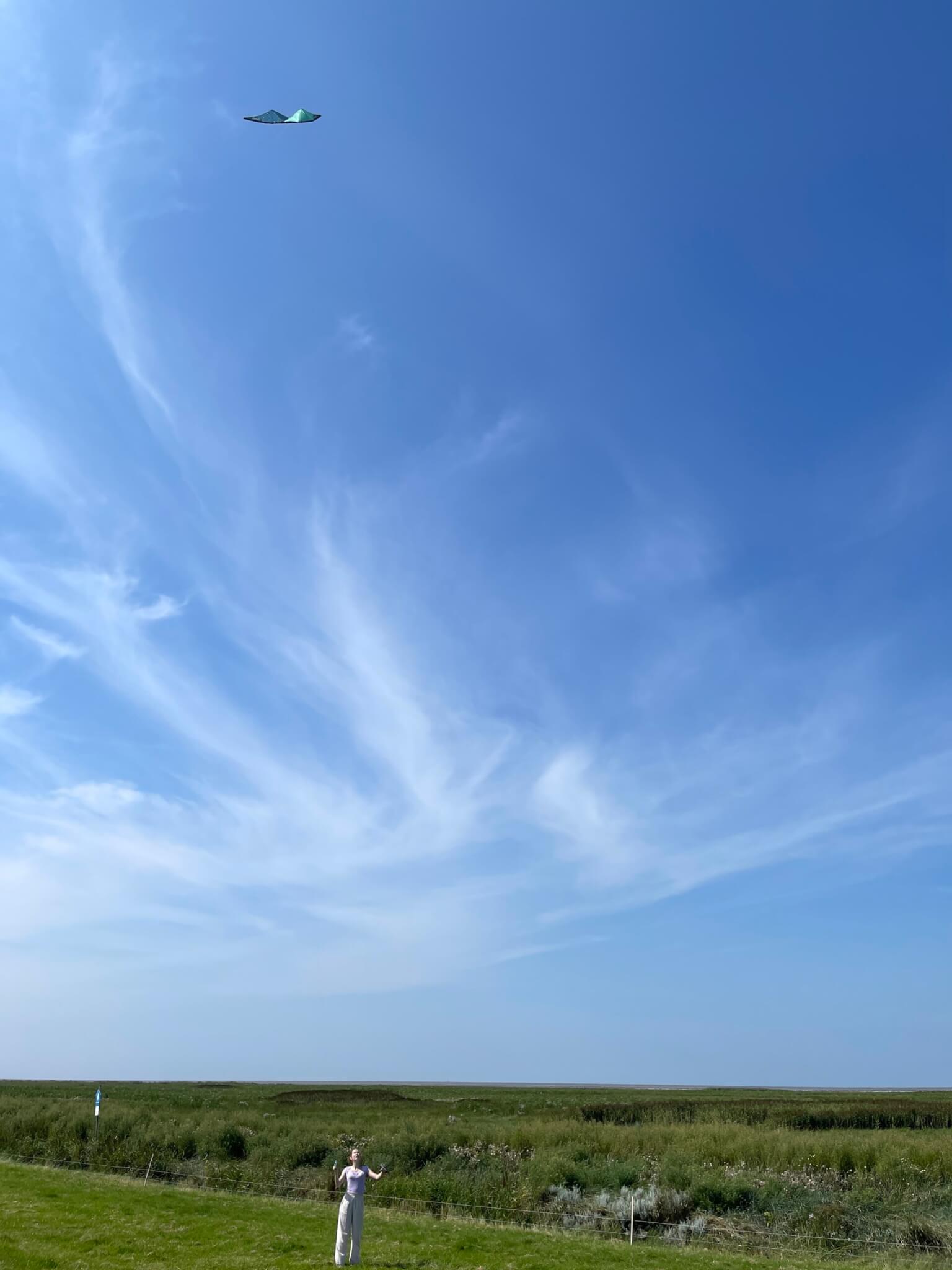 Werfen wir eine Blick über den Deich und das Meer ist schon wieder weg. So holen wir die Drache aus dem Auto, denn Wind geht genug und lassen diese steigen. Was für ein Spaß für uns alle.