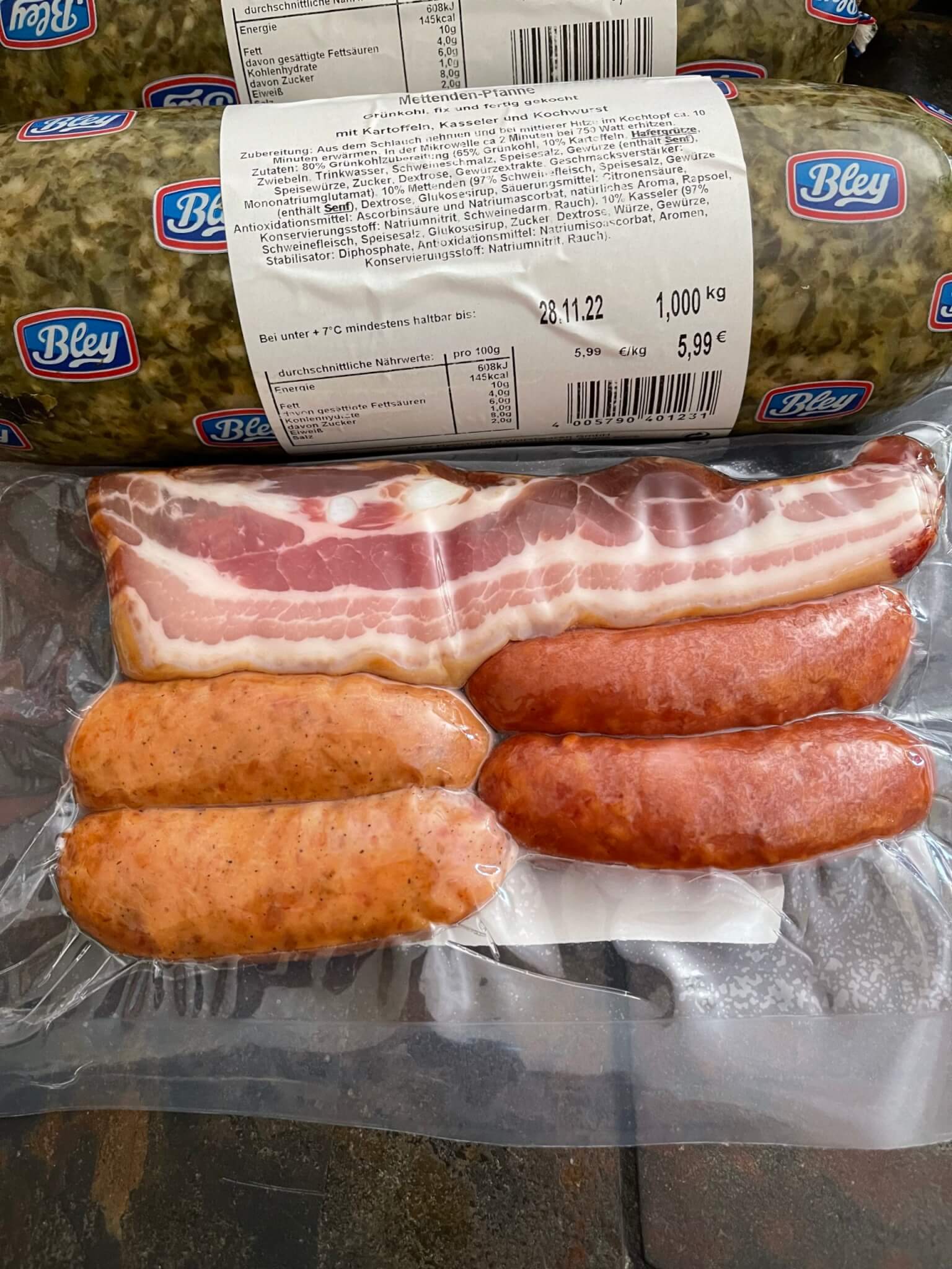 Alles da, was das Herz gegehrt. Fleisch, Wurst, Eintöpfe usw. Das wird sicher lecker.